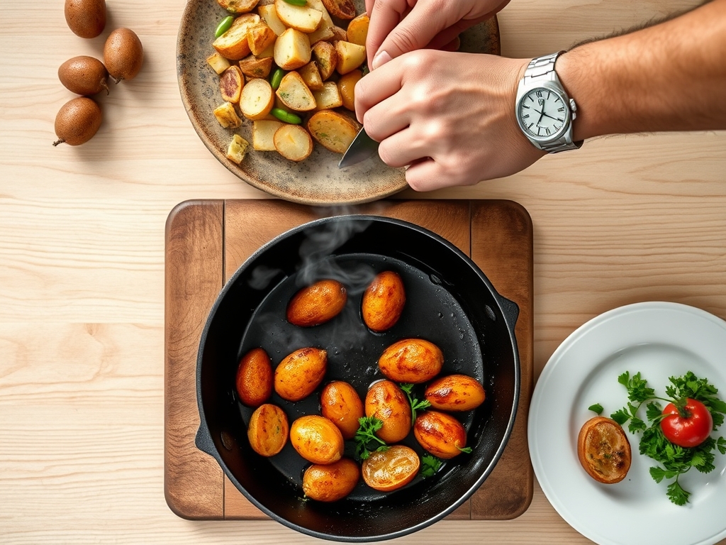 Pro Tip: This utilizes conductive heat transfer. Starting on a hot surface prevents the potatoes from sticking and immediately begins the searing process, locking in internal moisture.